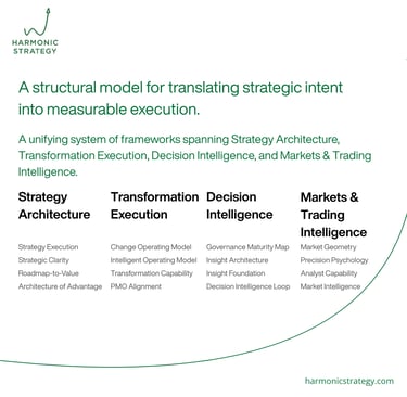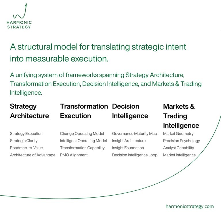 The Harmonic Strategy Execution System™ examines how strategic intent translates into coordinated execution across four interconnected domains: Strategy Architecture, Transformation Execution, Decision Intelligence and Markets & Trading Intelligence.